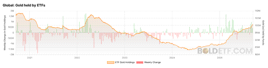 ETF holdings of gold have been trending higher, as shown below. However, it’s worth noting that the last time they were at these levels (September 2022), the gold price was US$1,600/oz. In other words, the price has doubled, and the retail investor hasn’t participated. It’s all been about Central Banks, a source of demand that bitcoin doesn’t have.