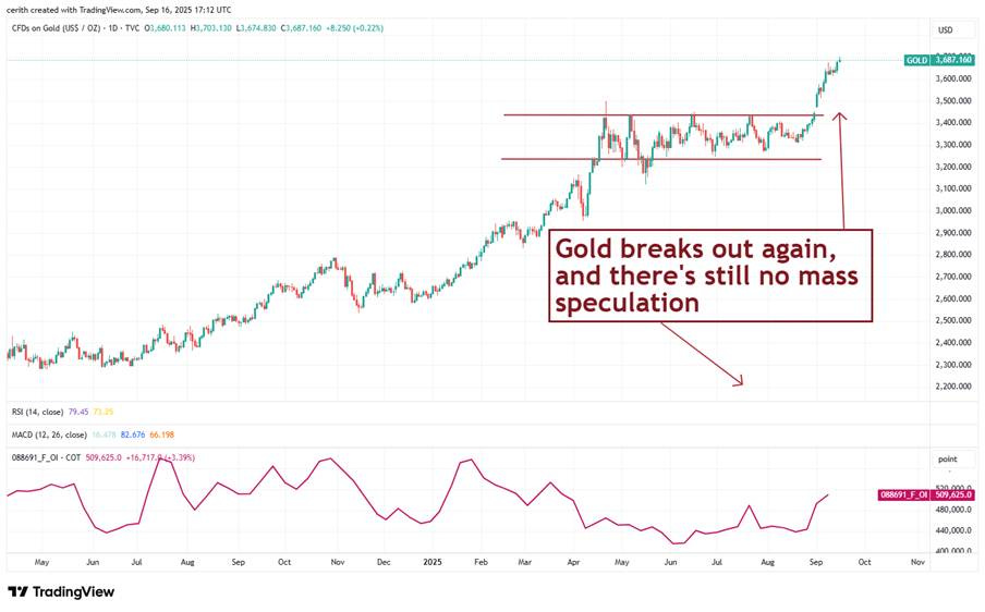 Gold, which is being acquired for the same reason as bitcoin, continues to motor higher. These are extraordinary moves and there is absolutely no indication of an investor frenzy, as shown by subdued open interest in the lower of the two charts above.