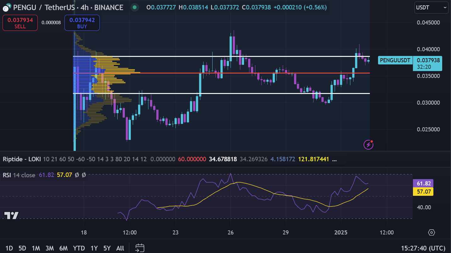 This rally signals strong investor confidence and sustained market momentum. Unlike speculative price movements, PENGU’s rise is driven by real demand, thanks to its integration with the broader Pudgy Penguins ecosystem. With the RSI resetting from overbought and the price looking ready to break resistance a $0.039, PENGU could be primed for a breakout.