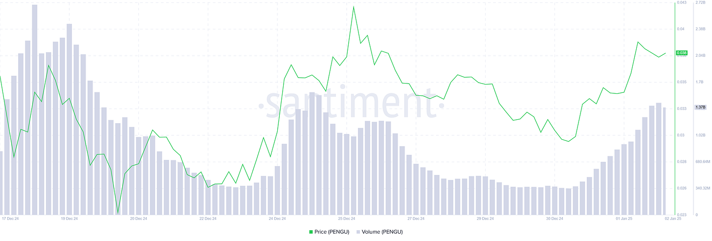 On the 1st of January, PENGU surged 17.5%, challenging BONK to become Solana’s top meme coin with a market cap of around $2.5 billion. Trading volume also jumped 86%, exceeding $1 billion.