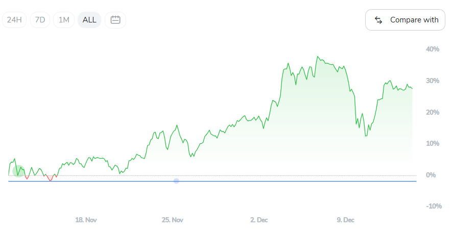 On November 13, so-called “Dino” Coins — XRP, HBAR, Stellar, and Cardano — spiked in unison. At its peak, XRP rose 335%, HBAR 575%, Stellar 440%, and Cardano 150%. Since then, they’ve pulled back 20-35%, compared to a 15% drop in the broader altcoin market.
